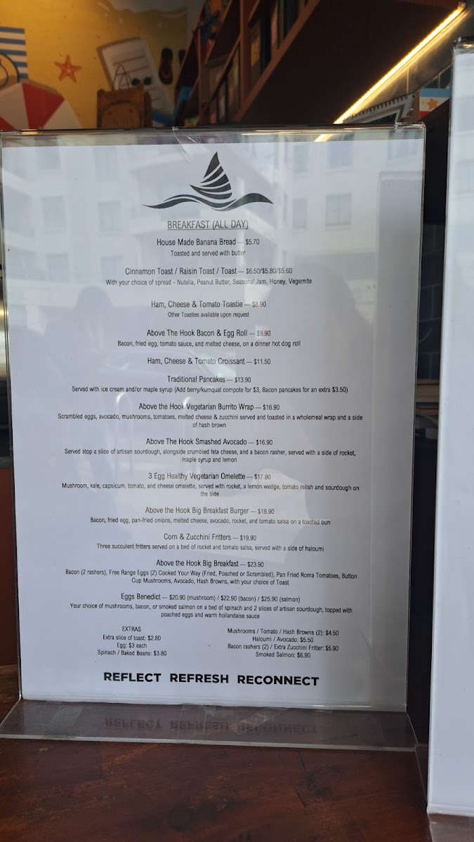 From a reviewer’s perspective, the breakfast menu at Above The Hook offers a simple but satisfying selection that focuses on classic, comforting options done well. Standout choices include the House Made Banana Bread and Cinnamon Toast, which are ideal for a lighter start to the day, while more filling options like the Ham, Cheese & Tomato Toastie and the Above The Hook Bacon & Egg Roll cater to those wanting a hearty breakfast. The Ham, Cheese & Tomato Croissant adds a slightly more indulgent, café-style option to the menu. Overall, the menu is concise but thoughtfully put together, featuring familiar breakfast favourites that are easy to enjoy, making it a reliable spot for a casual morning meal.